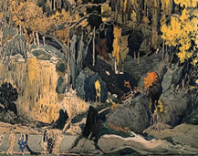 Léon Bakst , artiste peintre, décorateur et costumier russa va faire en 1912, un projet de décor pour « Prélude à l’après-midi d’un faune »(ci-dessus), de Claude Debussy et va réaliser une aquarelle pour la couverture du programme de la saison 1912 des ballets russes intitulée : « Nijinski dans l’après-midi d’un Faune » (ci-dessus).