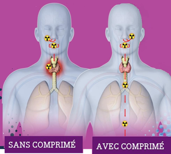 Les comprimés d’iode permettent de saturer la glande thyroïde pour qu’il n’y ait plus de place dans la thyroïde pour stocker l’iode radioactif.