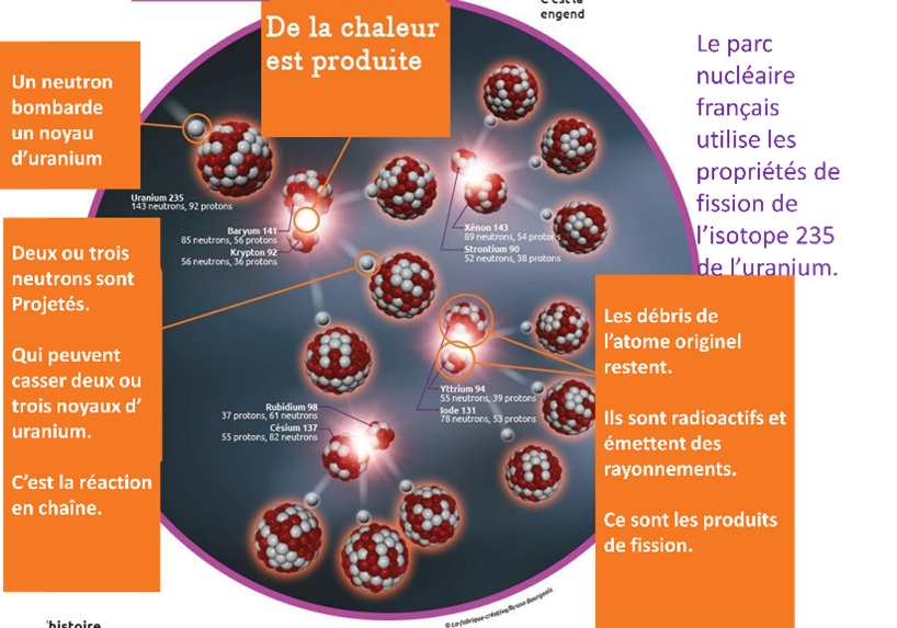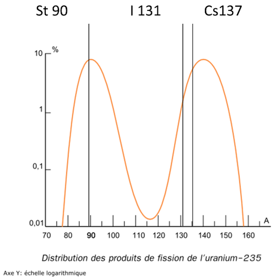 Lorsque l’Uranium 235 se casse, il génère de nombreux corps radioactifs de masses atomiques proches de 120. L’iode 131, le Césium 137 et le Strontium 90 sont les plus nombreux et les plus problématiques par leurs effets sanitaires : Iode=>thyroïde, Césium=>potassium des muscles, Strontium=> phosphore des os.