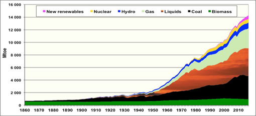 Jancovici a établi un tableau d’évolution de la consommation d’énergie dans le monde entre 1860 et 2010 (en millions tonnes équivalent pétrole).