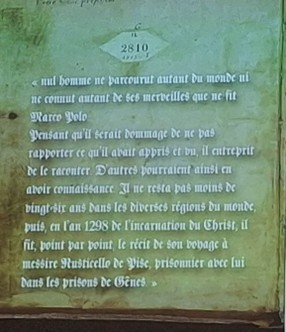 C’est là qu’il rencontre l’écrivain Rustichello, qui parle aussi français. Il croit aux récits que Marco Polo fait de son long voyage et lui propose de les mettre par écrit dans un livre qui s’intitulera le » Devisement du Monde » puis « Livre des Merveilles ». Il paraîtra en 1299.